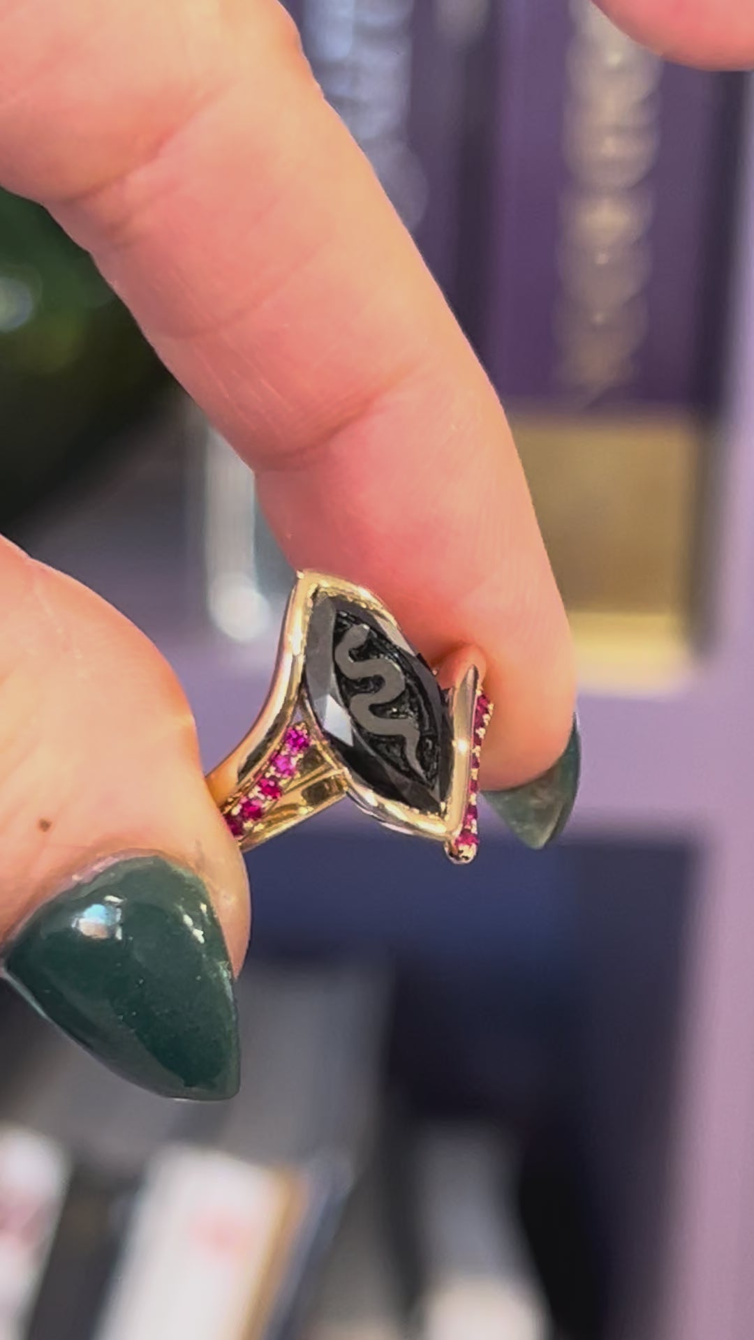 Quinn is the perfect edgy wedding set for the person that wants something different. This carved marquis black diamond with a custom snake design is the only one of its kind. The sleek, bypass style setting with Longido ruby accents is truly eye catching. This ring is in stock in a size 6.5. While these rings can be sized, due to the nature of this design, we recommend soldering both rings together once they've been sized.